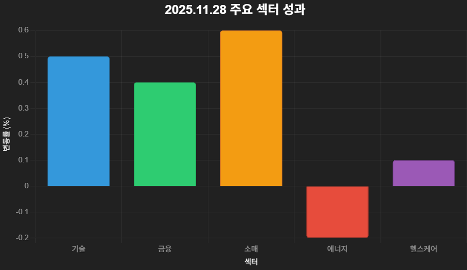 블랙프라이데이 소비 증가로 소매 및 기술 섹터가 두각을 나타내고 있습니다. 기술 섹터는 나스닥 상승을 주도하며 0.5% 이상 올랐고, 금융 섹터도 0.4% 상승으로 안정성을 보입니다. 반면 에너지 섹터는 유가 변동으로 0.2% 소폭 하락했습니다. 아래 차트는 주요 섹터의 일일 변화율을 시각화한 것입니다.